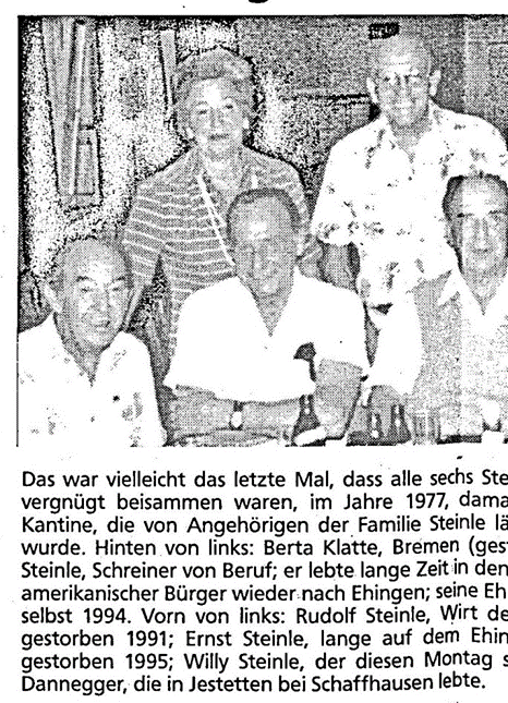 Willy Steinle ist weit in der Welt herumgekommen; diese Beweglichkeit hat sich an seine drei Söhne weitervererbt: Einer von ihnen lebt in Frankfurt, einer in Montreal/Kanada, einer in Stuart/Florida. Willy Steinle selbst erblickte das Licht der Welt vor bald 95 Jahren in der pakistanischen Großstadt Quetta, das damals zum britischen Weltreich gehörte. In der Folge des ersten Weltkriegs musste die Familie in die deutsche Heimat zurückkehren und kam in den zwanziger Jahren auf den Ehinger Gasthof „Traube”. Willy Steinle führte das Hotel vor allem in der Zeit, nach dem Zweiten Weltkrieg, bis in die Mitte der 1960er Jahre [1966]. Damals sollte das Hotel renoviert werden. Weil das Gemäuer aber zu altersschwach war, wurde es abgebrochen und an seiner Stelle von der Einkaufsgenossenschaft Konsum/Coop ein neues Gebäude hochgezogen, in dem Willy Steinle und seine Frau noch einige Jahre ein Hotel Garni führten. Als W. Steinle in den Ruhestand trat, führte seine Nichte Herta Fronwieser das Garni weiter, bis sie infolge eines Jagdunfalls starb.